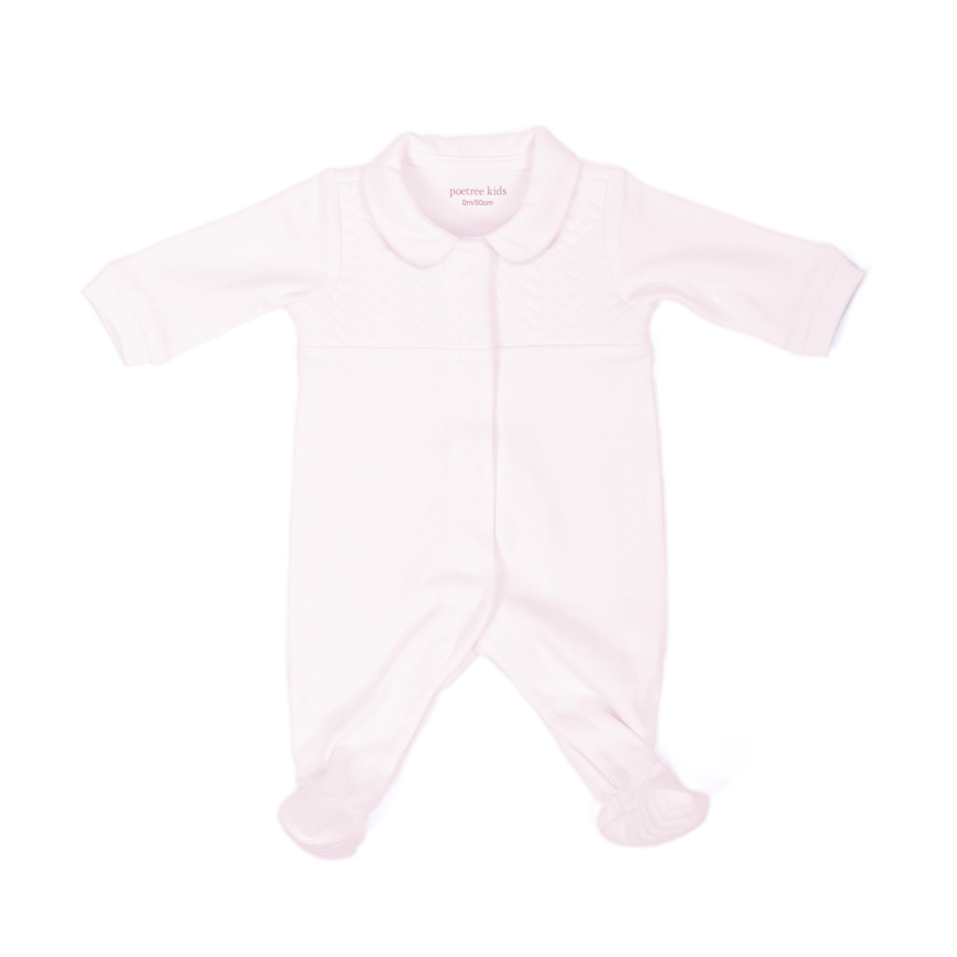 Dit babypakje gemaakt van zacht jersey heeft aan de voorzijde van het pakje en onderaan de voetjes een zig-zag patroon.