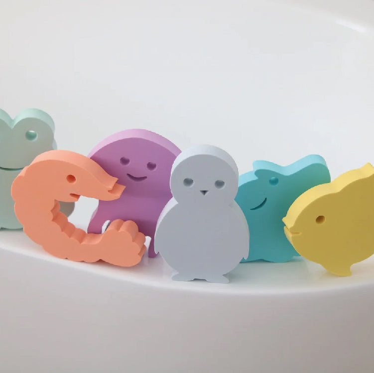 Met deze leuke Waterfun jumbo set die bestaat uit 6 herkenbare dieren uit de onderwaterwereld beleven kinderen de leukste avonturen in bad, douche, zwembad,... . De manta, kwal, goudvis, kikker, garnaal en de pinguin nemen je mee op het leukste onderwater avontuur. De diertjes kunnen blijven plakken aan de bad - of douchewand , je kan een vlot bouwen door de figuurtjes op elkaar te stapelen en nog veel meer met deze unieke Waterfun Jumbo set van MOES.