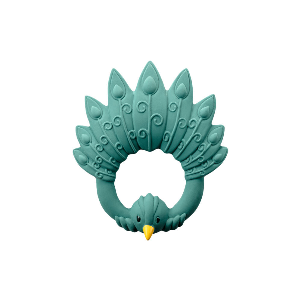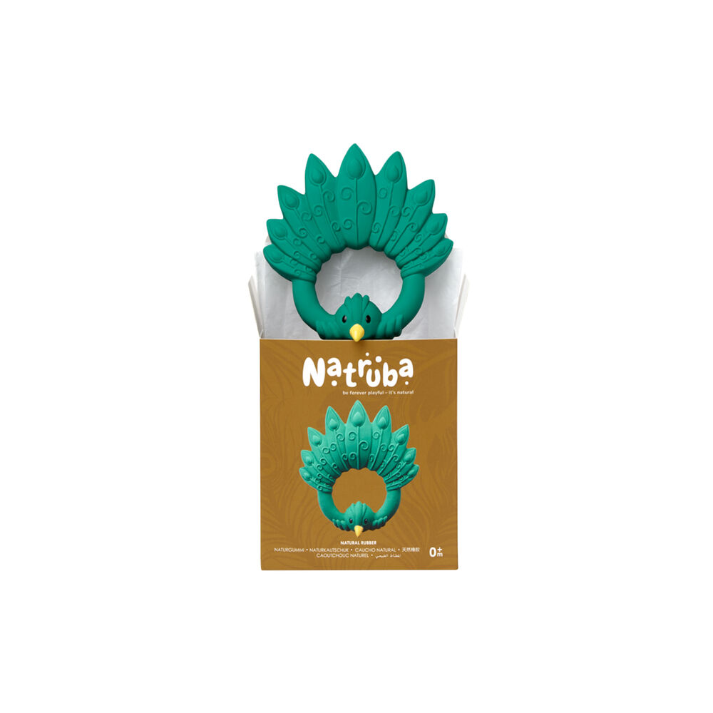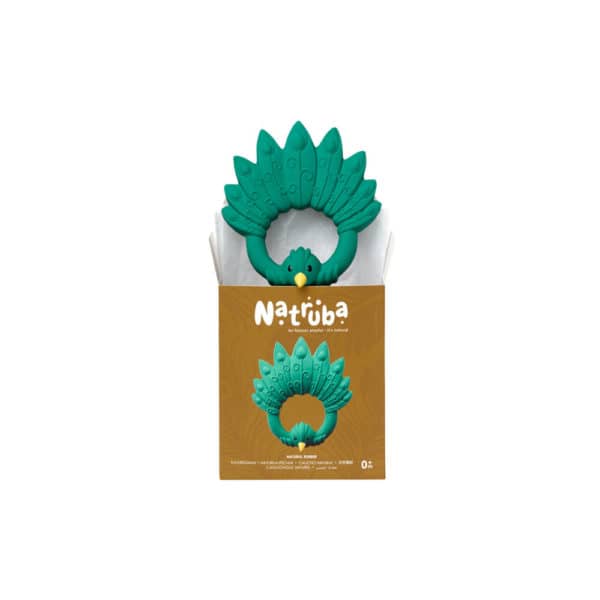 De Natruba pauw is gemakkelijk vast te pakken voor kleine handjes met verschillende oppervlakken om zintuiglijk spelen te stimuleren en het zachte natuurlijke rubber voldoet gemakkelijk aan alle stadia van pijnlijk tandvlees.