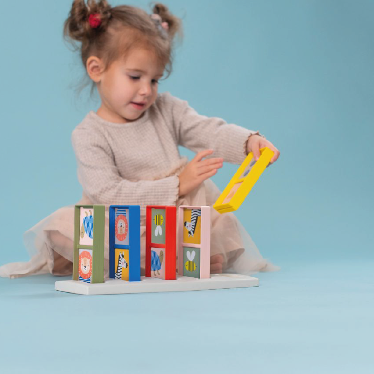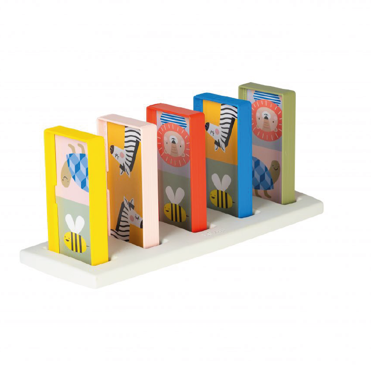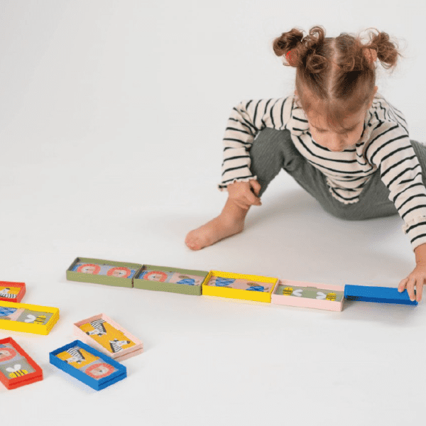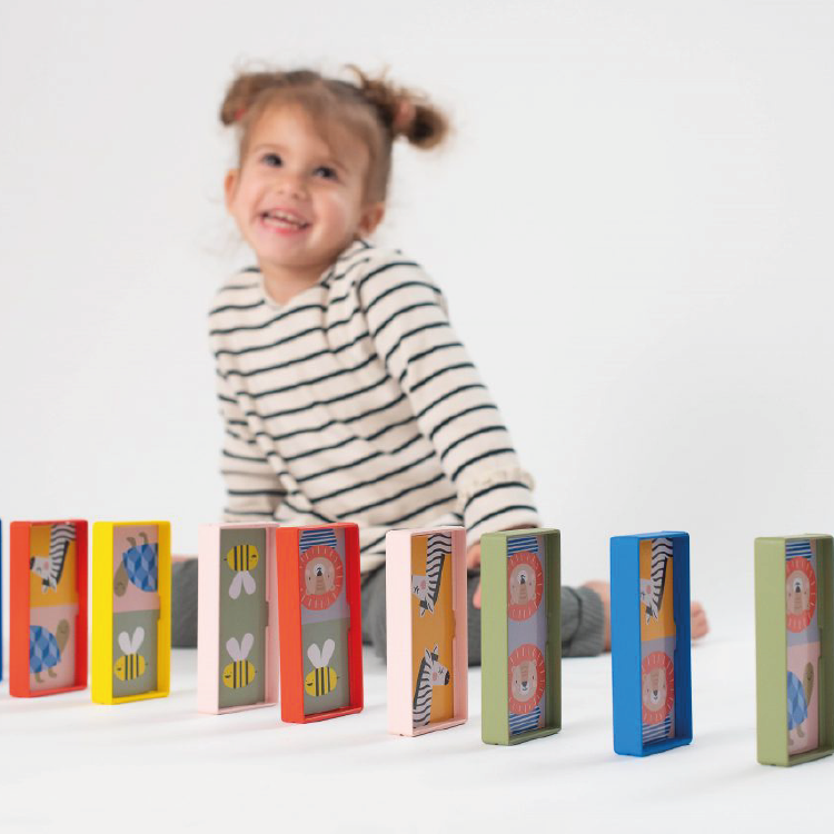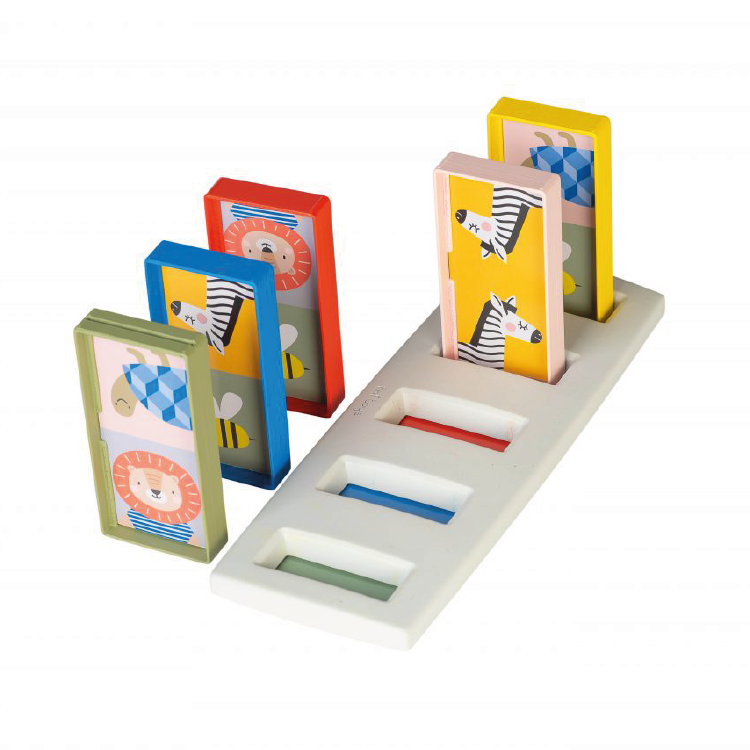 Domino is hét ideale spel om met peuters te spelen. De regels zijn eenvoudig en het spel helpt kinderen hun visuele vaardigheden, fotografisch geheugen én motorische en cognitieve vaardigheden te ontwikkelen. Deze domino kan je op verschillende manieren spelen, voorverschillende leeftijden en dus verschillende ontwikkelingsfases: domino rally met de houder - domino rally met matchen, herkennen en benoemen van kleuren - domino met het matchen van afbeeldingen - domino met het herkennen van vormen en aantallen - domino rally zonderde houder. De supergrote, dubbelzijdige dominostenen (6x12cm) passen perfect in kleine handjes, aan de ene kant staan er illustraties op, aan de andere kant geometrische vormen en aantallen. Dit dominospel groeit mee met je peuter en bevordert de fijne motoriek, cognitieve vaardigheden, hand-oogcoördinatie, kleur- en vormherkenning. Inclusief1 plastic houder.