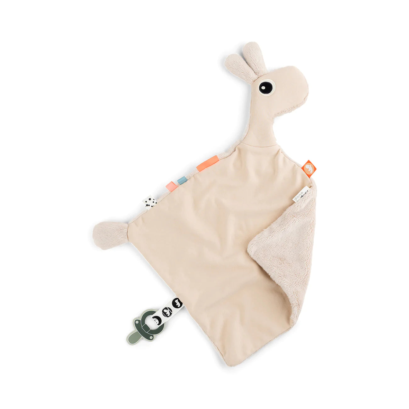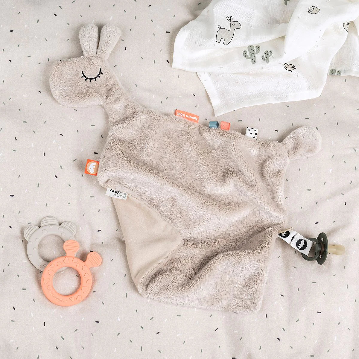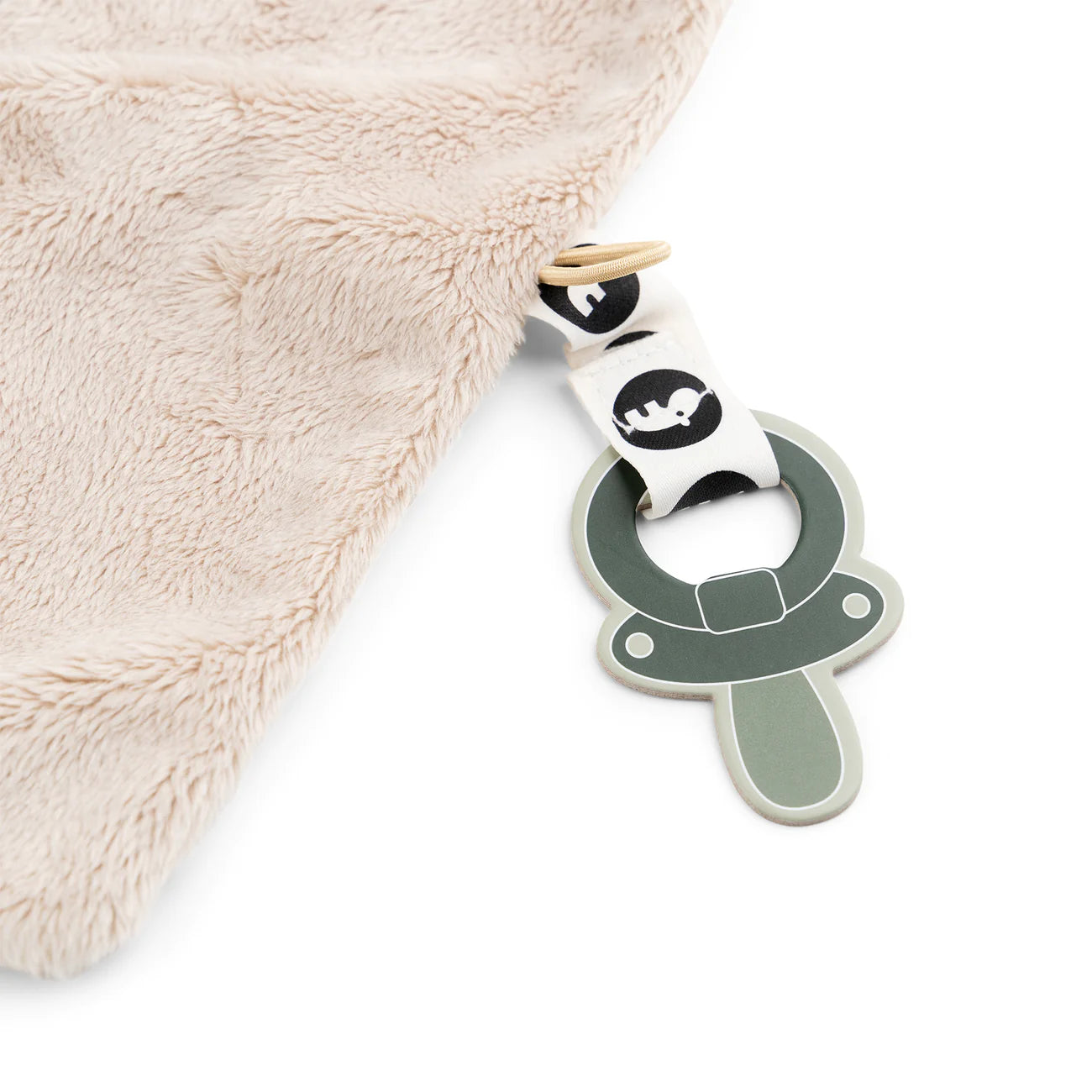 Het knuffeldoekje zit boordevol leuke tags en spannende texturen om te ontdekken. De praktische klittenbandclip houdt het fopspeentje dichtbij.