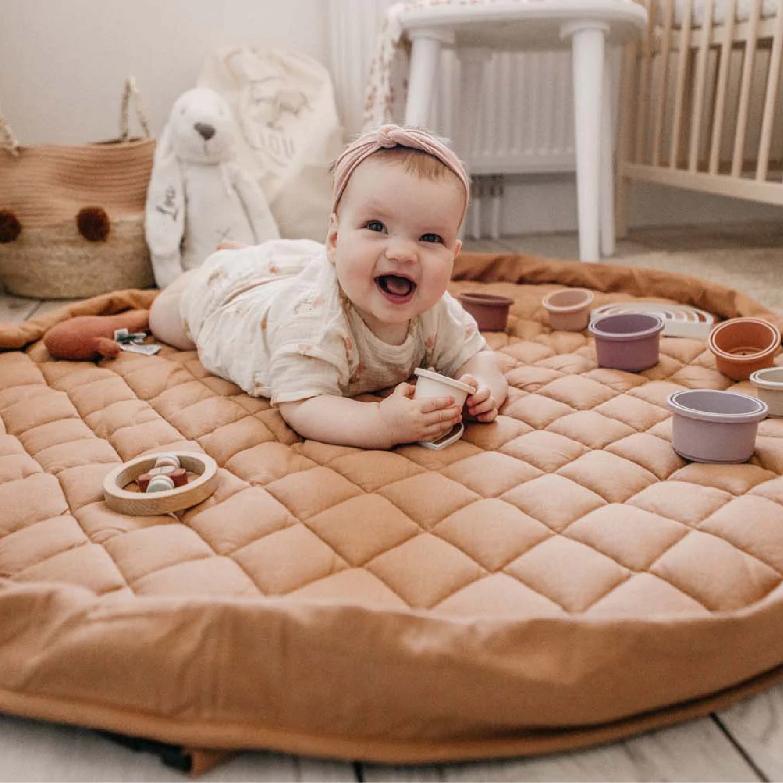 Een uniek gewatteerd baby-speelkleed dat tegelijkertijd ook opberg-speeltas en luiertas is. 120 cm in diameter en gemaakt van GOTS biologisch katoen om de baby maximaal plezier en comfort te geven. Dit speelkleed en luiertas is zo praktisch en functioneel voor dagelijks gebruik.
