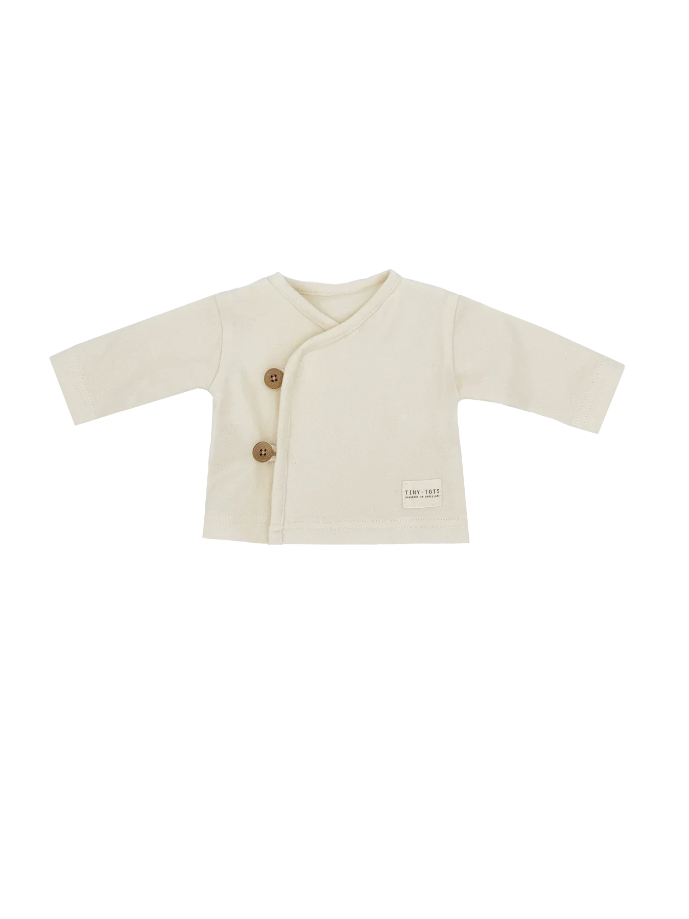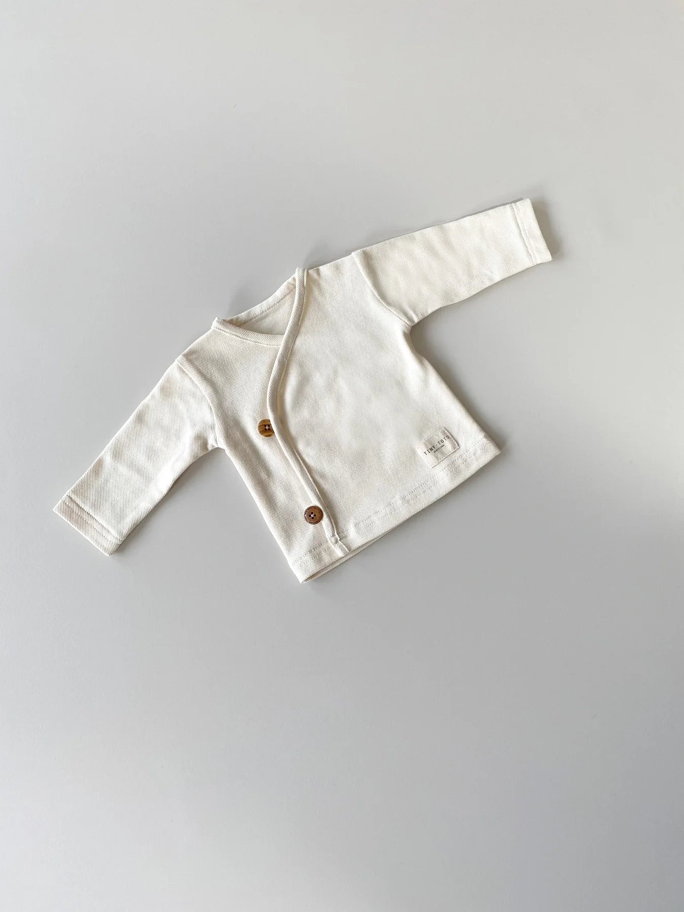 Dit newborn shirt met lange mouwen is met de hand gemaakt in Barcelona van een gebreide stof in biologisch katoen, die heel zacht en delicaat is voor de babyhuid.