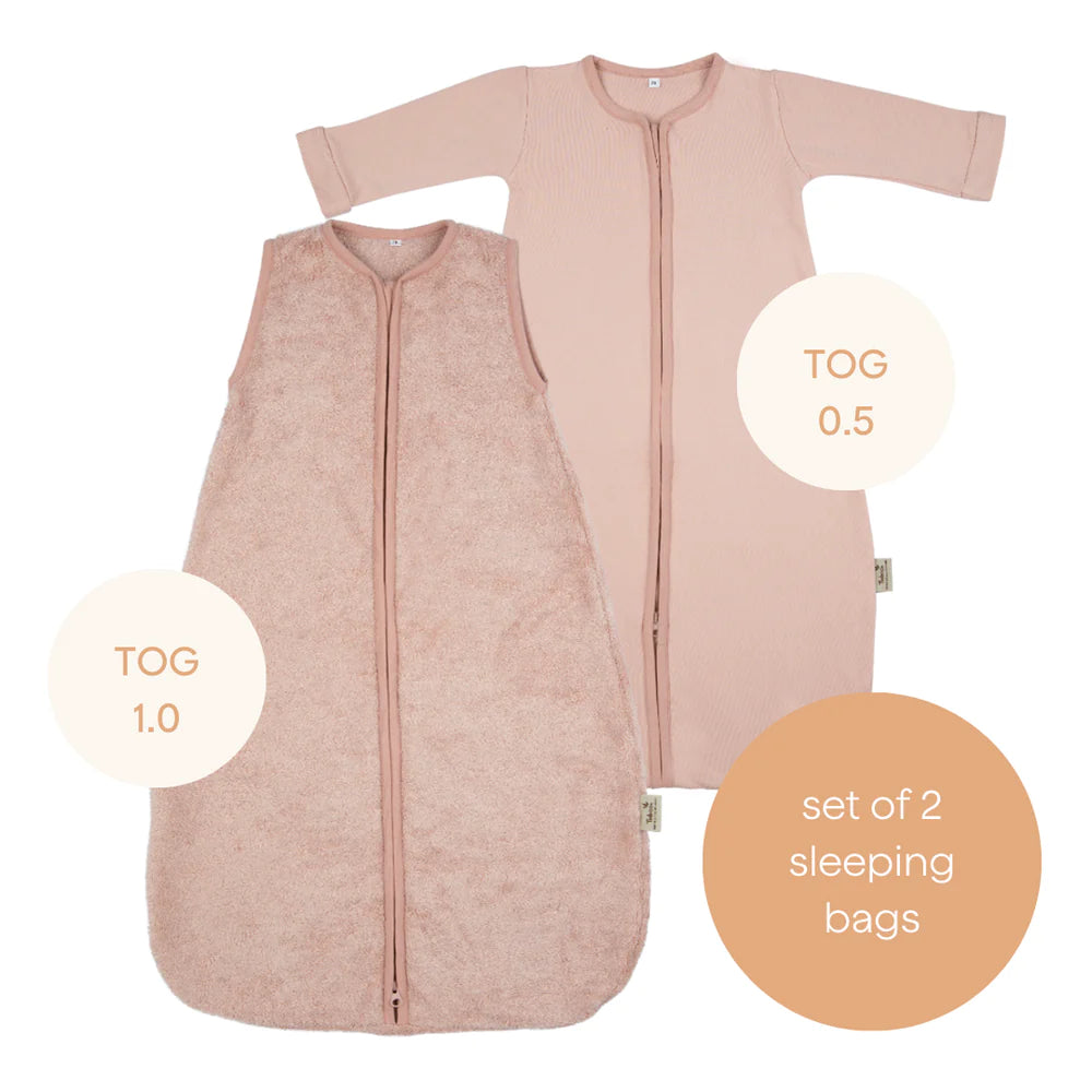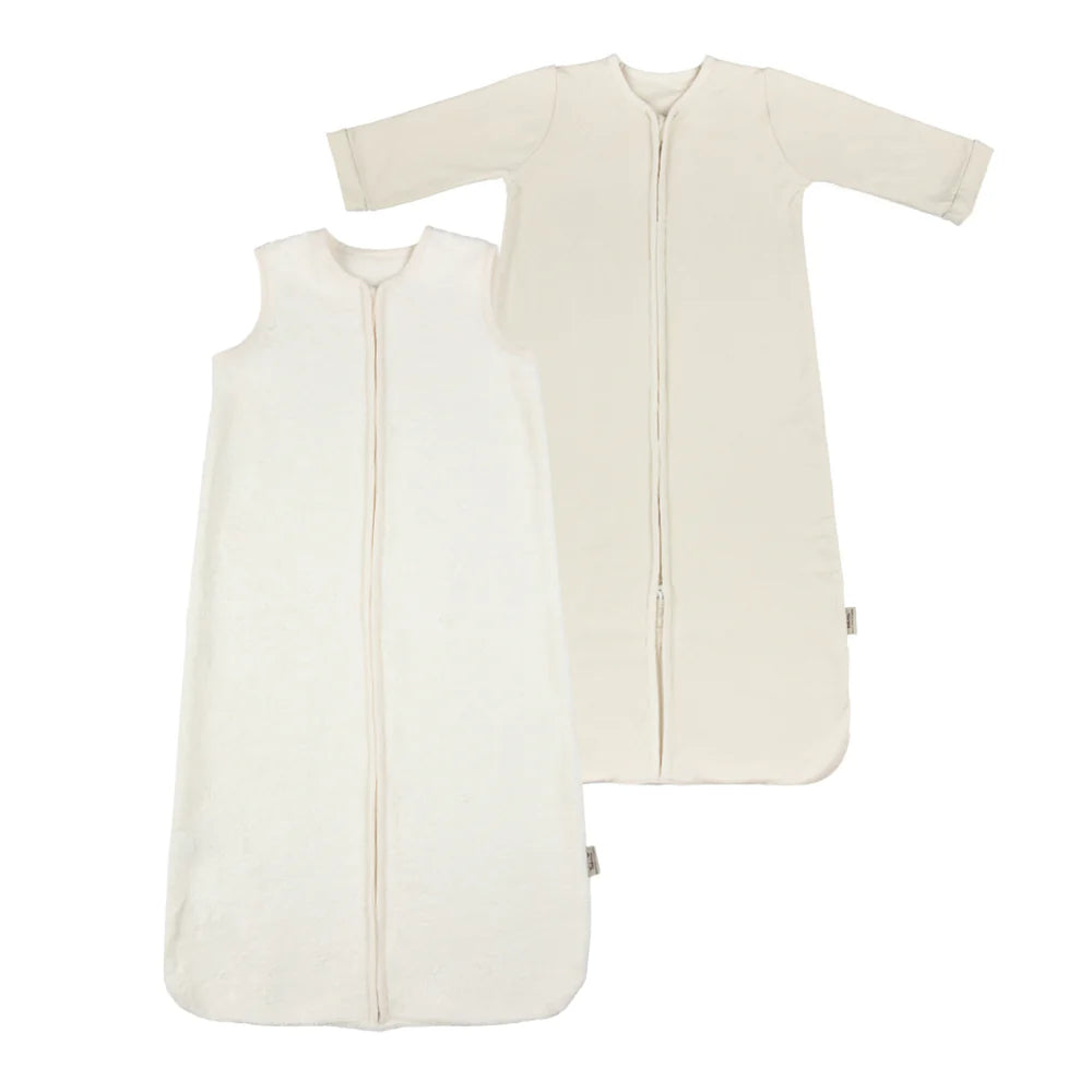Deze unieke slaapzak bestaat uit een set van 2 slaapzakken die samen of apart gedragen kunnen worden, naargelang de wisselende seizoenen en temperaturen. De binnenslaapzak heeft mouwen en is gemaakt van bamboejersey, terwijl de mouwloze buitenslaapzak gemaakt is van bamboebadstof.