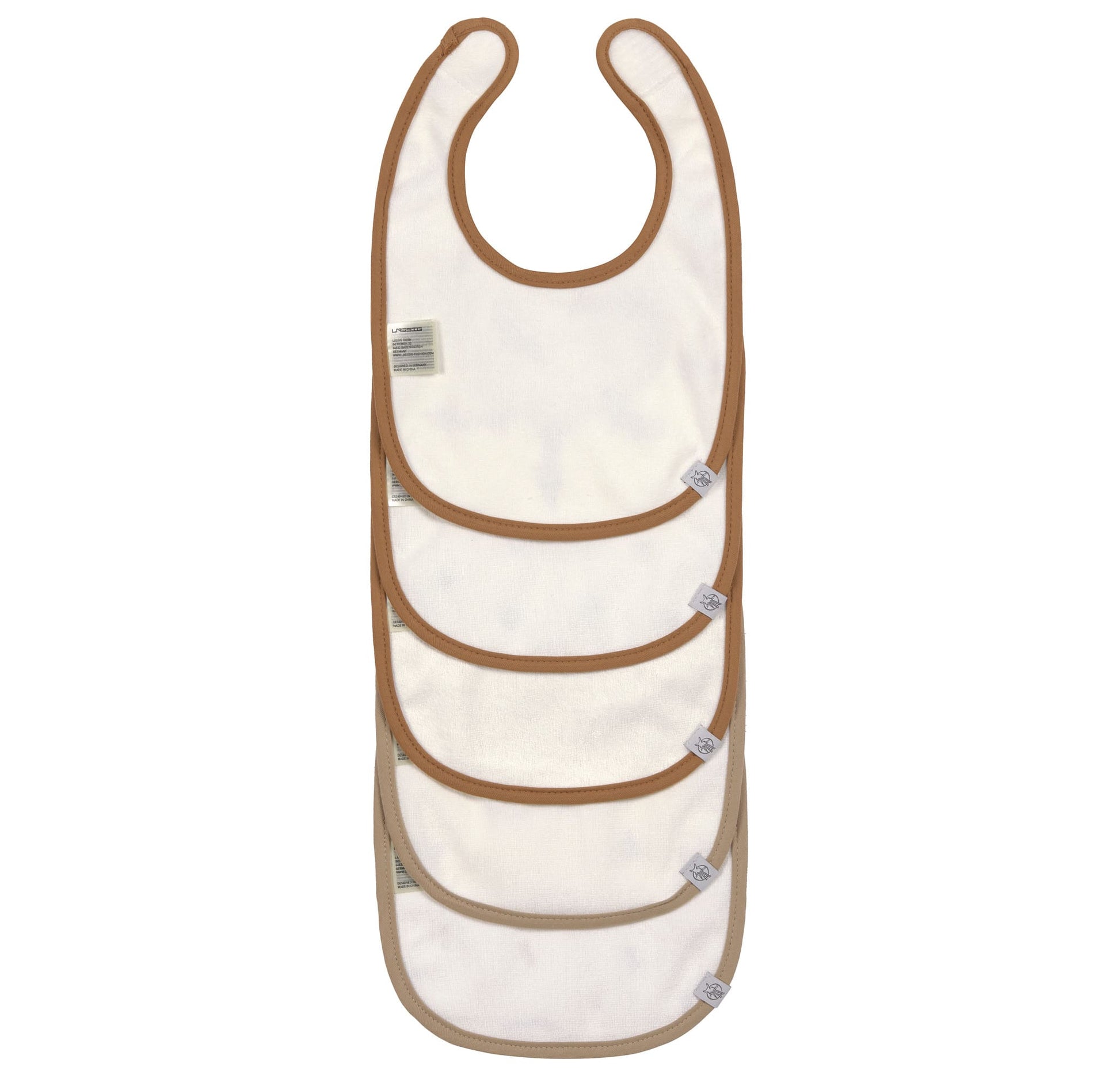 De slabbetjes hebben een velcrosluiting aan de achterkant en zijn gemaakt van een gemakkelijk te onderhouden biologisch katoen/polyestermix en hebben een waterdichte binnenvoering om de babykleding eronder absoluut droog te houden.