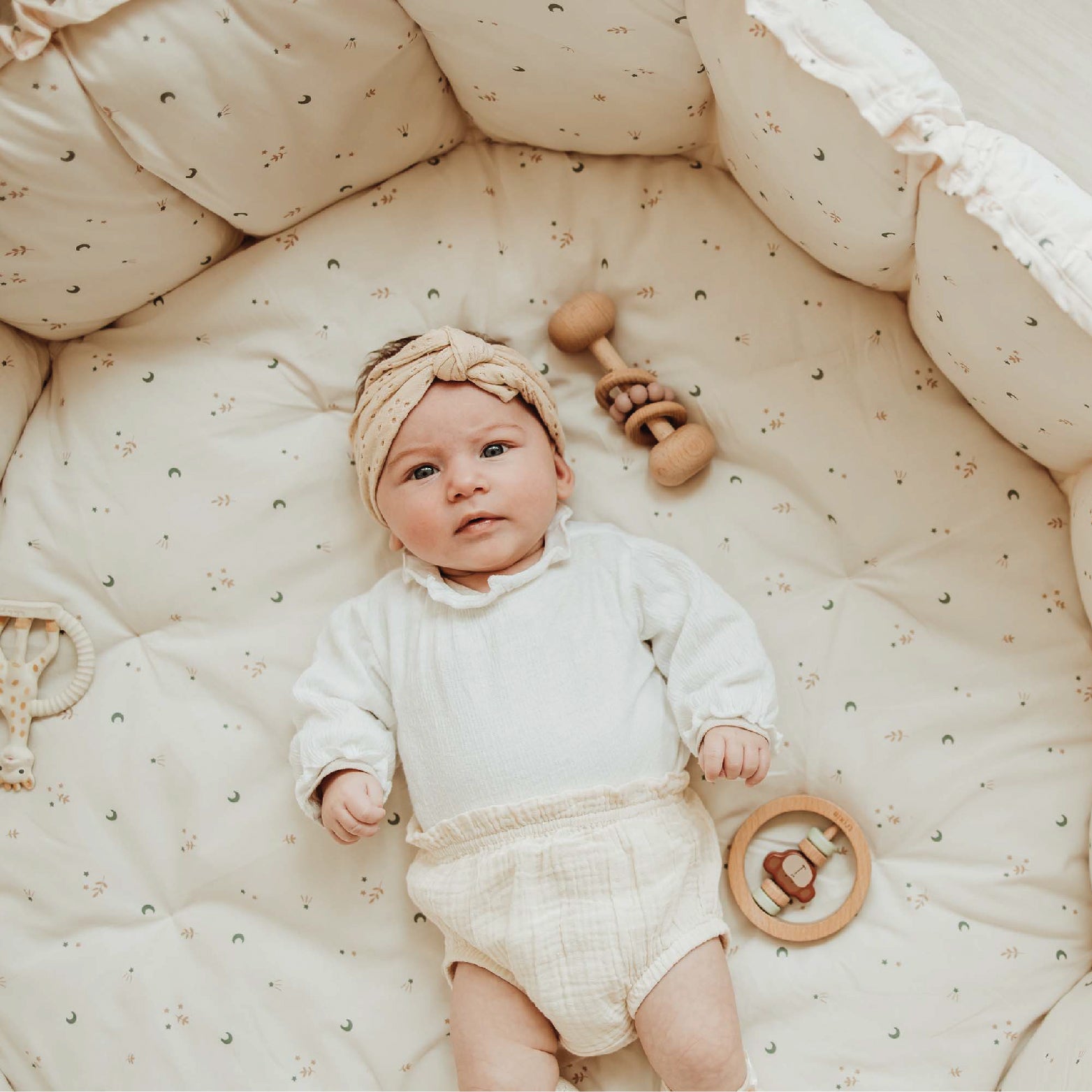 De Play&Go Bloom is een uniek 3-in-1 speelkleed dat meegroeit met je kind. Als de bloemblaadjes omhoog staan, vormen ze een veilig wiegje voor je baby, met zachte stootranden als bescherming. Als het speelkleed in bloei staat, gaat het open en gaan de stootranden omlaag, zodat er een grote, comfortabele speelmat voor baby's ontstaat. Perfect voor buikdutjes, spelen onder toezicht en ontdekken. De Play&Go Bloom kan ook tentoongesteld worden in de kinderkamer of speelkamer, om het favoriete speelgoed van je kind op te bergen en alles op één plek te bewaren.