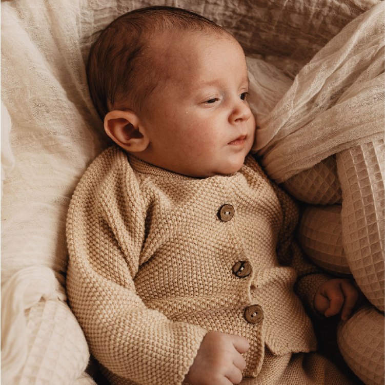 Het gebreide vestje is gemaakt van een mooie kwaliteit katoen. Zacht en comfortabel voor je baby. Tijdloos door zijn eenvoud, dus ook nog te gebruiken voor een volgend kindje of om door te geven. Sluit aan de voorkant met knoopjes.