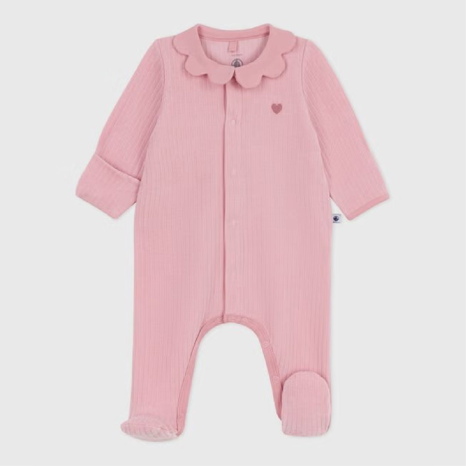 Deze verfijnde en vrouwelijke pyjama, met een kraag in bloemblaadjesvorm en een hartborduursel, is ideaal als geboortegeschenk.