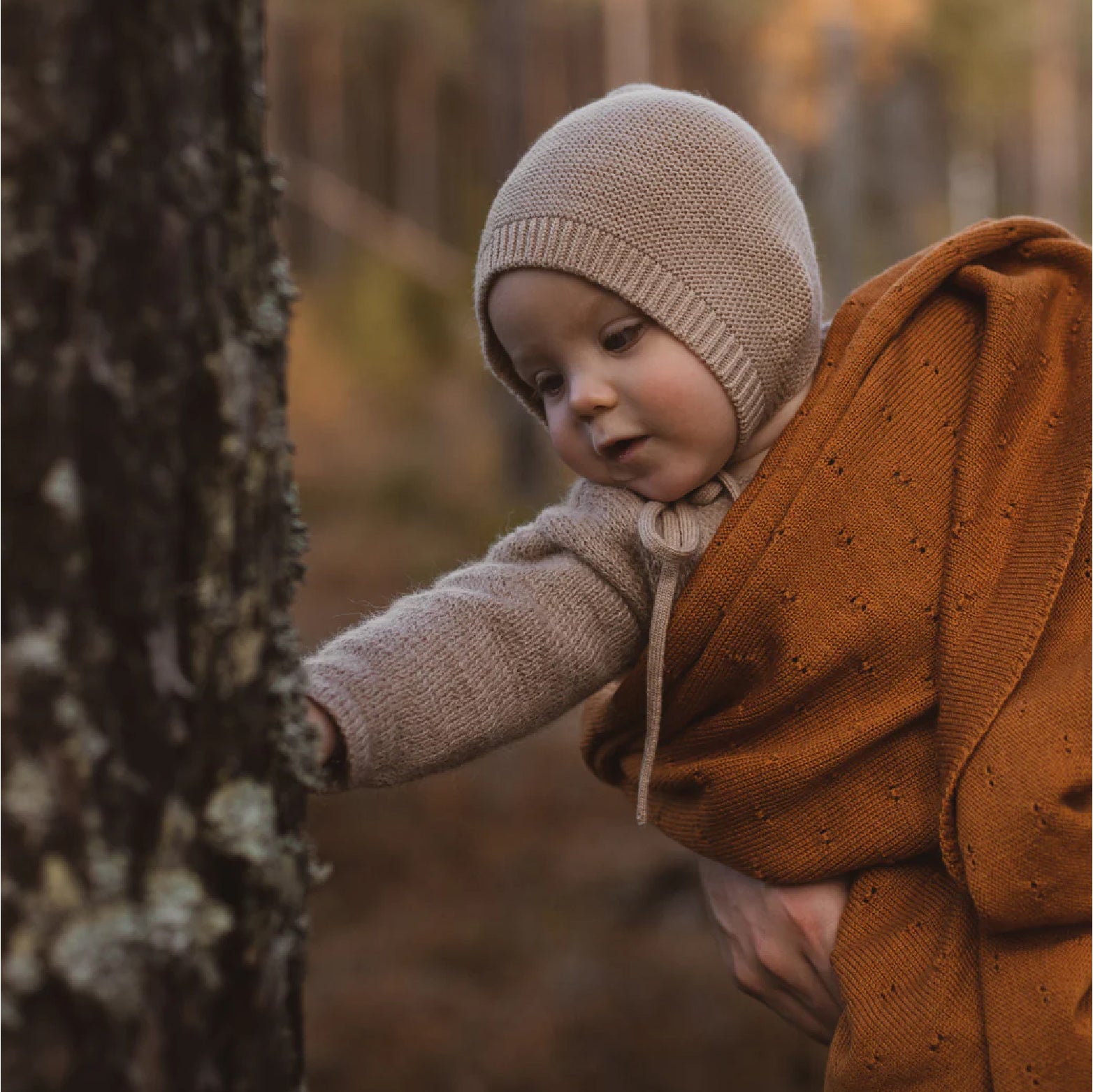 Een zachte, naadloze gebreide muts gemaakt van 100% merinowol. De muts is middelmatig dik en perfect om zowel buiten als binnen te dragen. Hij houdt baby's op een aangename temperatuur.