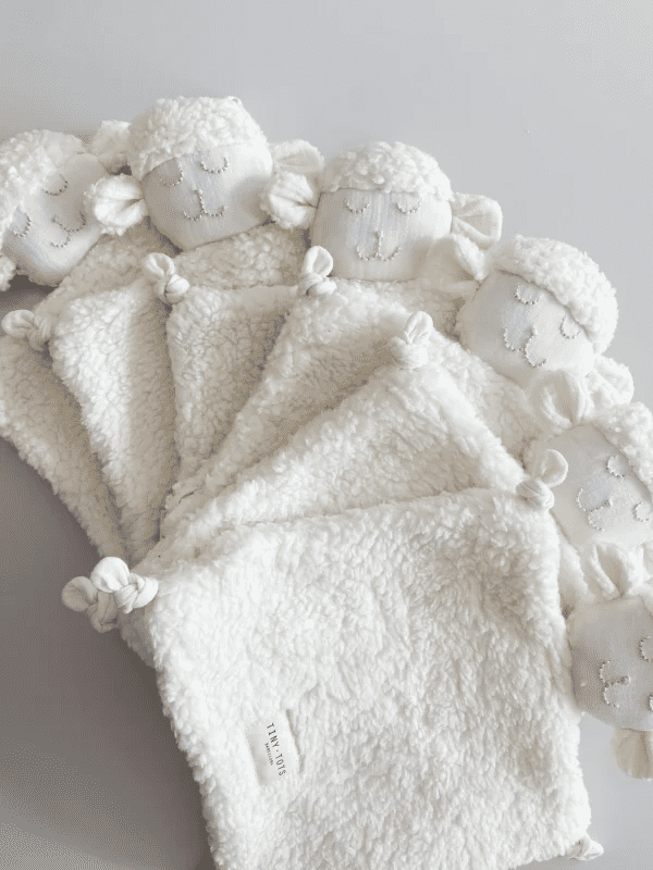 Het schaap teddy dou-dou is ontworpen en handgemaakt in Barcelona, van een teddystof in katoen en bamboe in biologisch katoen, die zeer zacht en warm is en de tere huid van baby's ten goede komt.