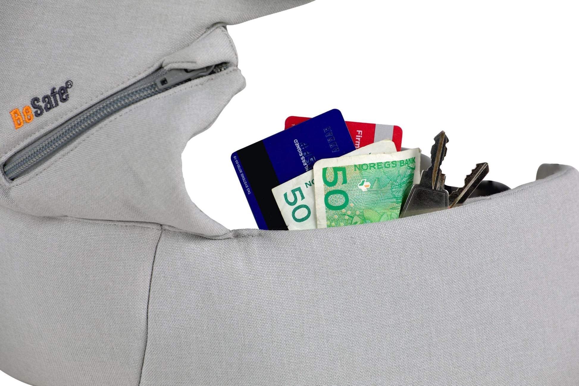 - Brede, zachte heupriem met veiligheidssluiting en handig opbergvakje aan de binnenkant (bankkaart, sleutel,…)