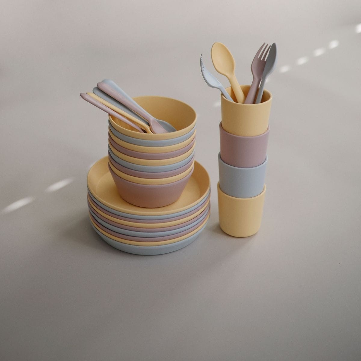 De Mushie bekers set van 2. De bekertjes kunnen tegen een stootje en zijn ideale servies voor peuters en kleuters.