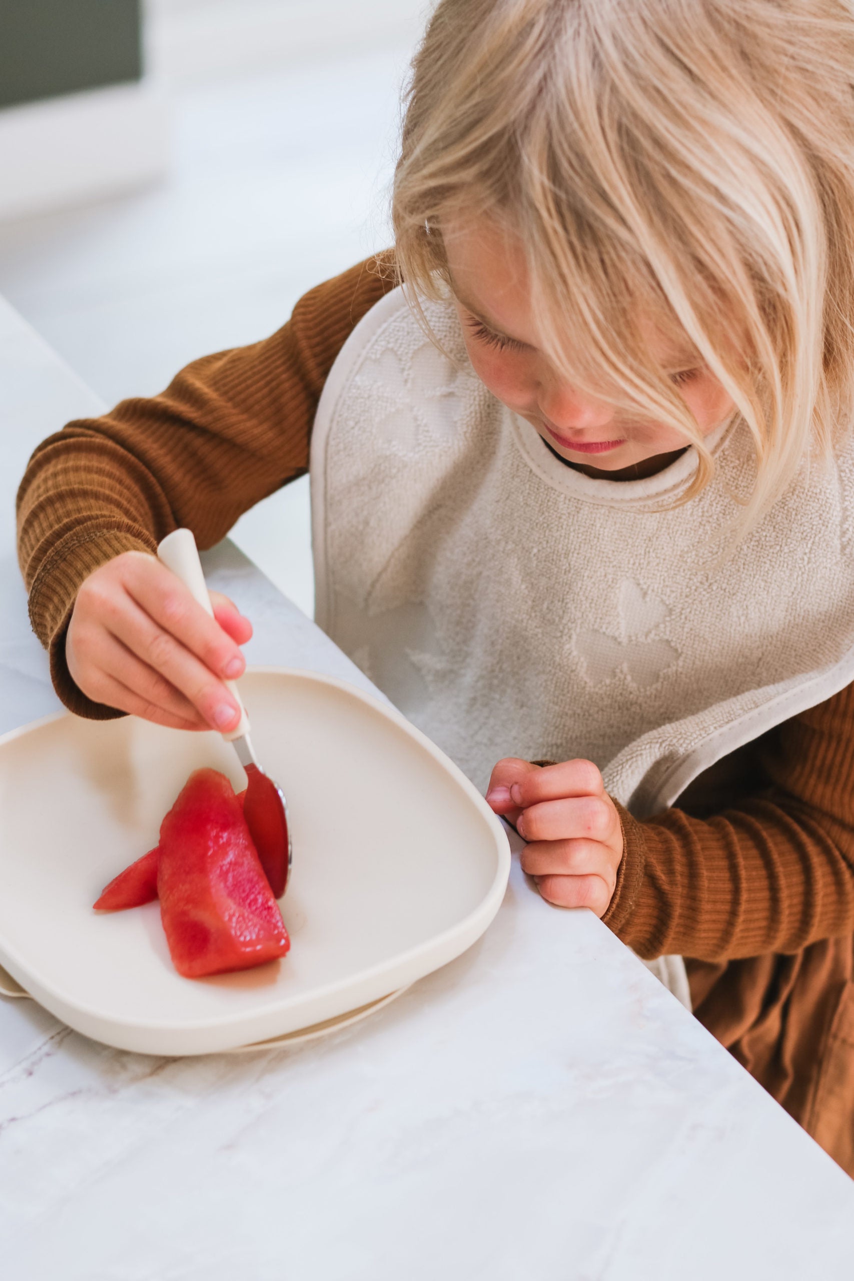 Het slabbetje kunt u met de touwtjes knopen zodat het rond de nek van uw kind past.