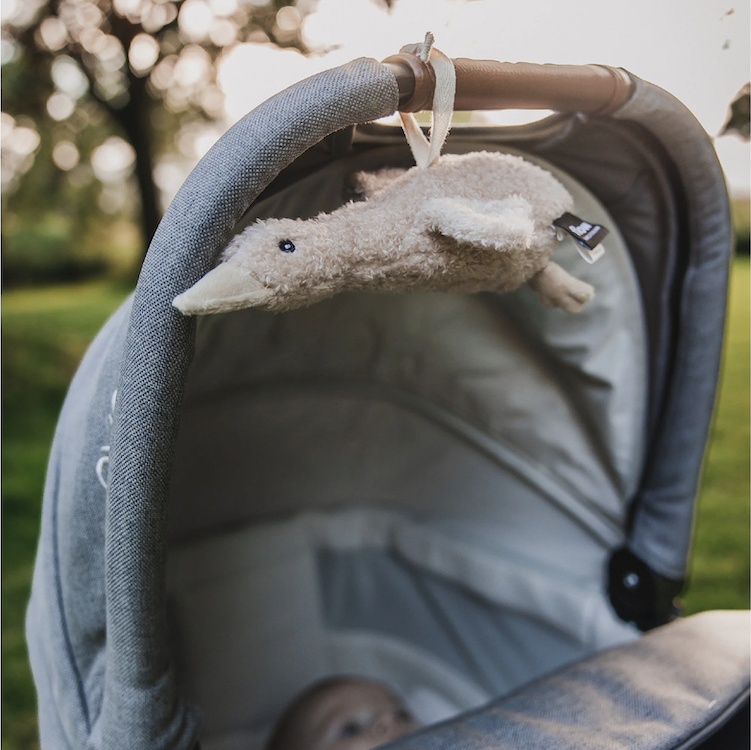 De comforter on the go is een kleinere versie om makkelijk met je mee te nemen. Een knuffel met muziekdoosje die er voor zorgt dat je kindje zich veilig en kalm voelt onderweg. Je kunt het gansje makkelijk bevestigen aan je Maxi Cosi of kinderwagen met het touwtje.
