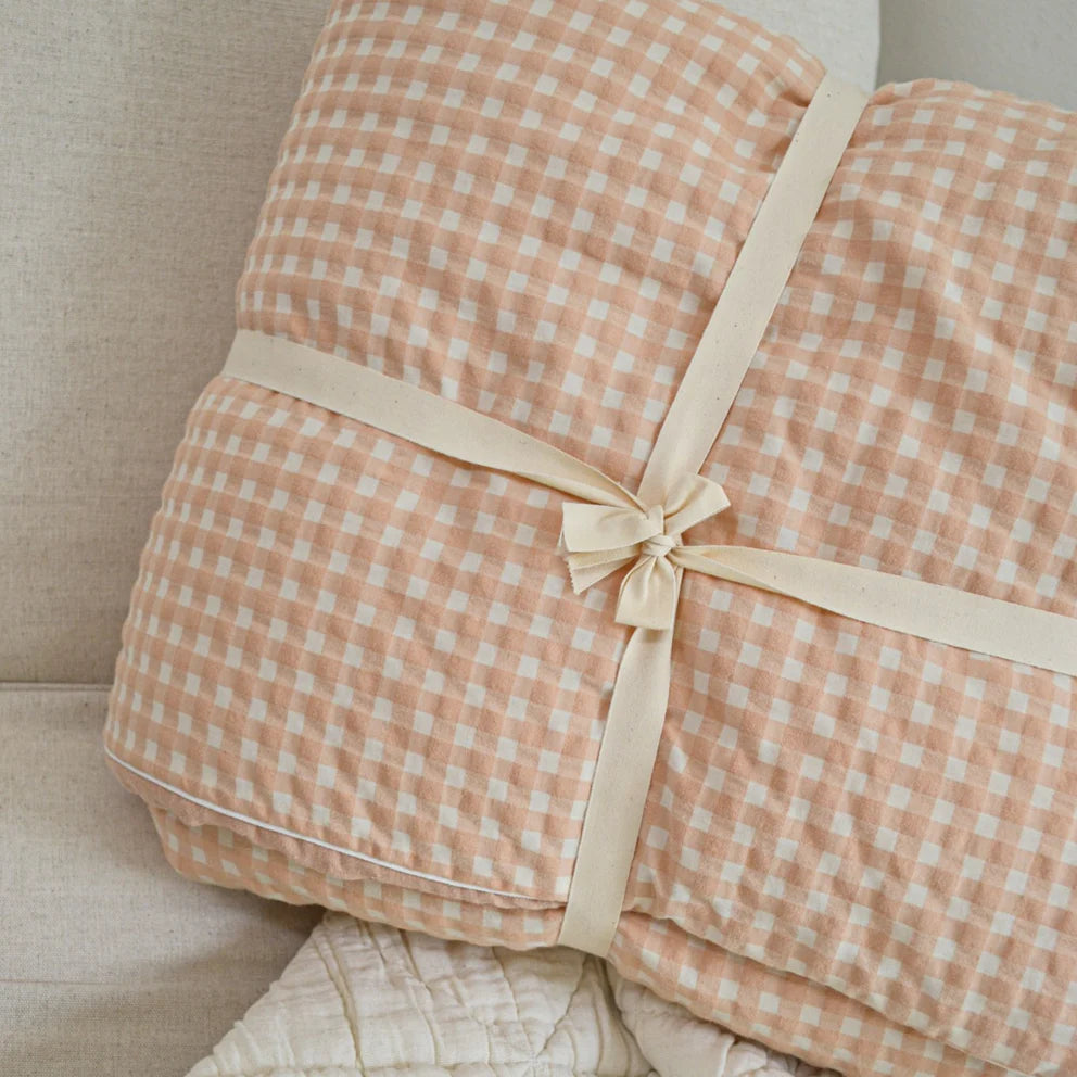 Blanket in a cream colored mousseline on 1 side, the other side in a printed cotton