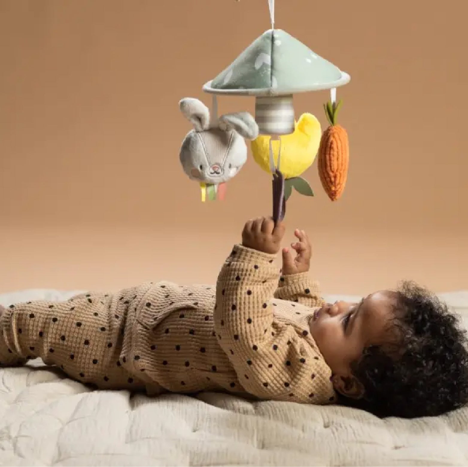 Deze kinderwagenmobiel is kleurrijk en interactief, ontworpen om baby's te entertainen en stimuleren terwijl ze in de kinderwagen liggen. Hij bestaat uit verschillende elementen, waaronder Rylee het konijntje, een wortel en tulpen die aan een groen bladerdak hangen en de ontwikkeling van visuele volgvaardigheden stimuleren. De mobiel bevat ook een rinkelend belletje en een bijtring in de vorm van een blaadje.