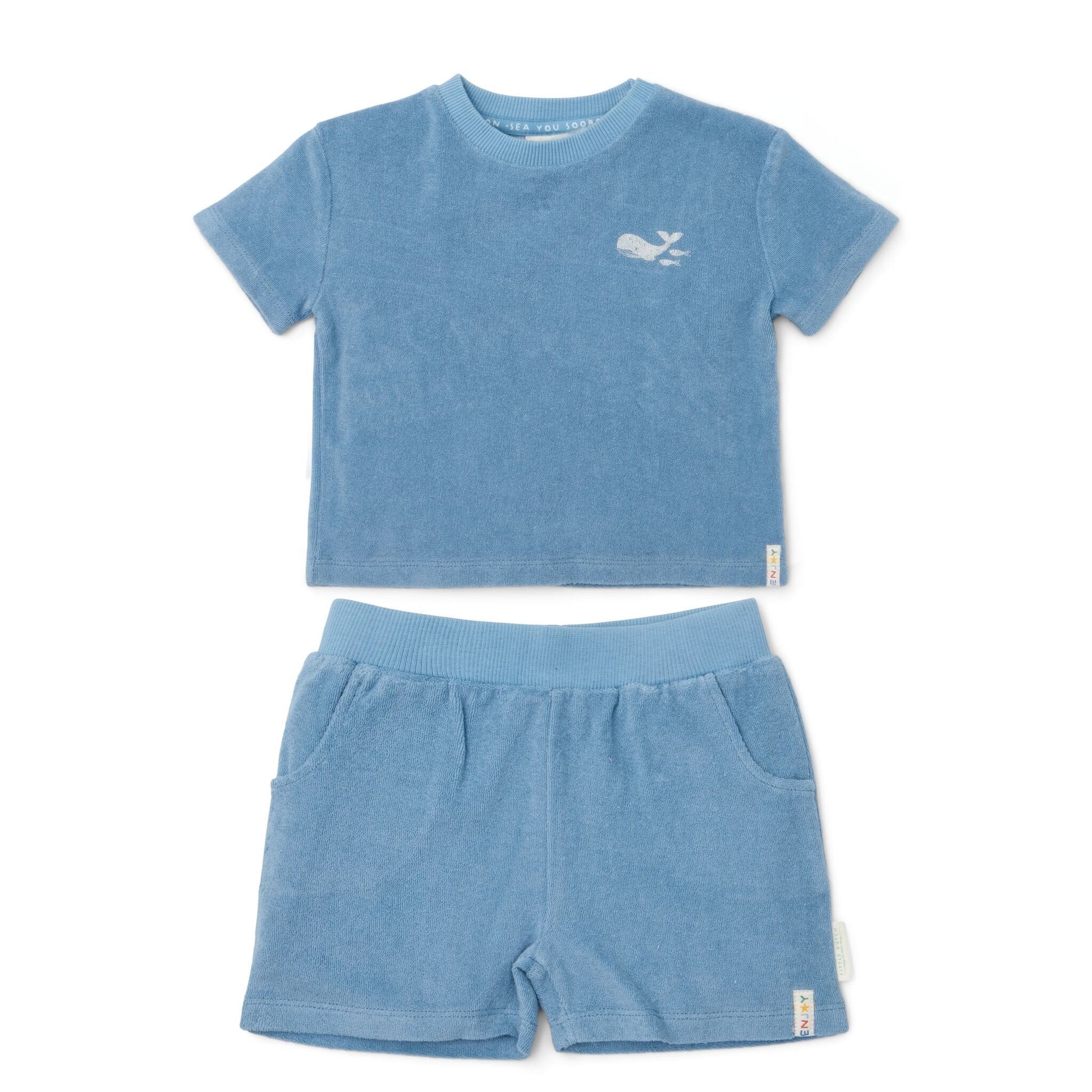Geniet van de zomer met onze T-shirt en short set uit de collectie Seashells and Stripes in de kleur Surf Blue. Gemaakt van 100% organisch katoen in zachte terry badstof, biedt deze set ultiem comfort na het zwemmen of op zonnige dagen. De rug van het T-shirt is versierd met een print van iconische zeedieren, wat een speelse en avontuurlijke uitstraling geeft. Perfect voor een dag vol zomerse avonturen.