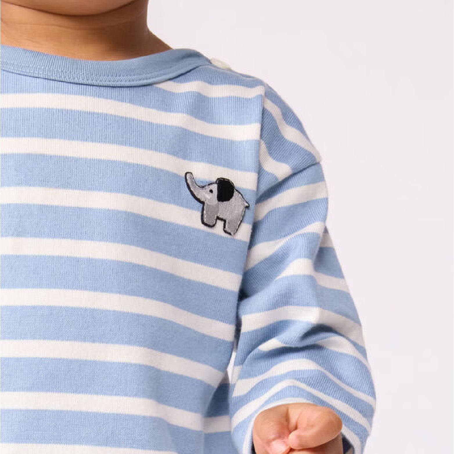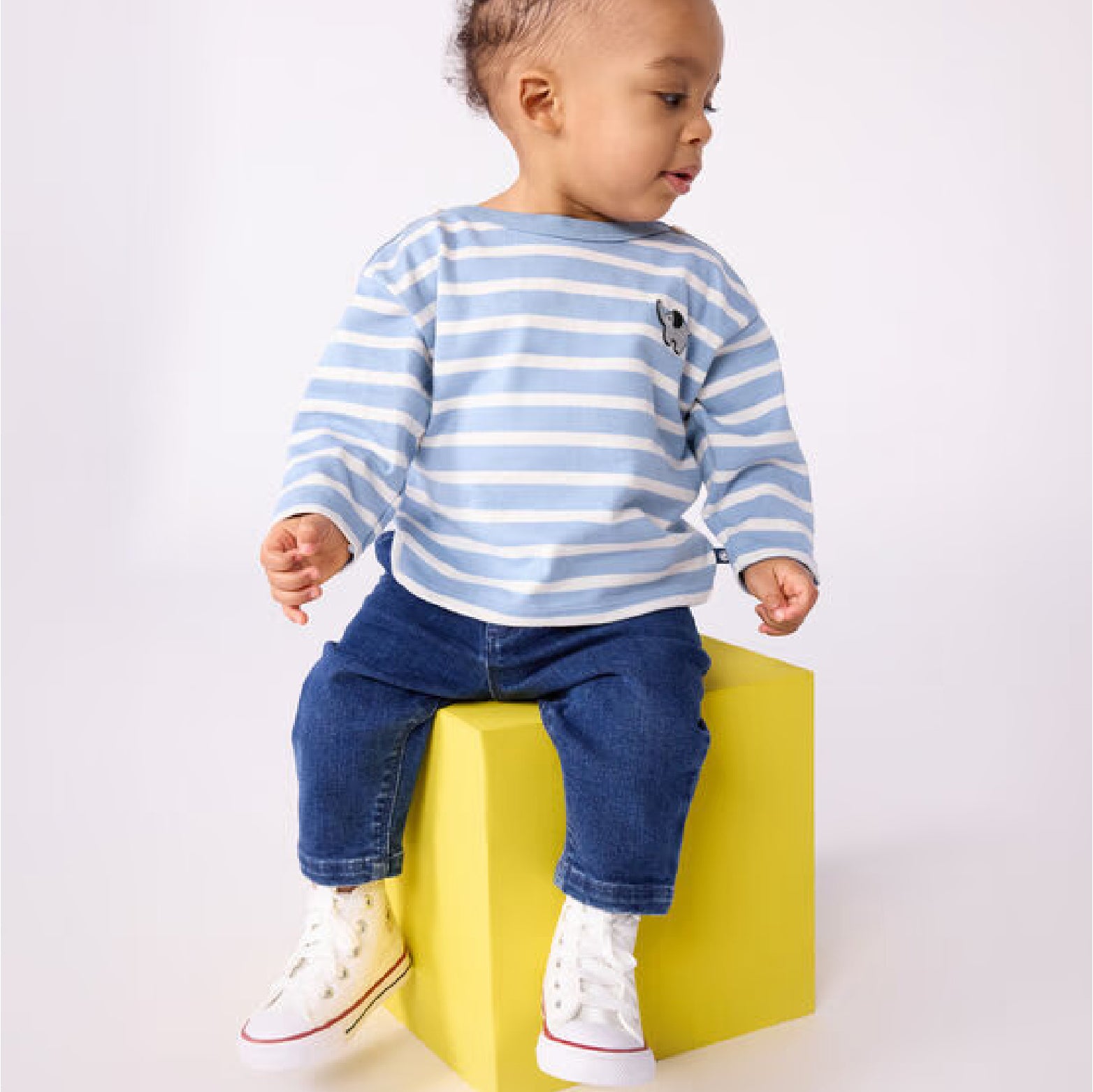 Het model is 74 cm groot en draagt maat 12 maanden.
